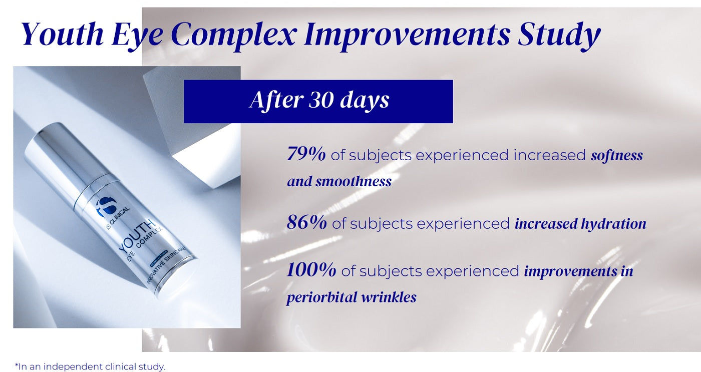 iS Clinical products produce immediate and long-term results and benefits, provided that products are applied properly and daily. Our Youth Eye Complex Clinical Study found an immediate boost in hydration and the refinement of fine lines and wrinkles in just four hours.